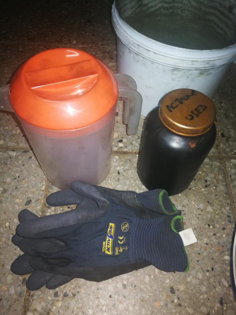 Acetone, gloves and a plastic water jug. The bullets go in the acetone bottle, swirl them in the acetone for 10 seconds, then pour bullets and acetone in to the jug. It's then easy separate the bullets from the acetone by emptying the acetone back into it's bottle. Pour the bullets onto a paper towel and wait for them to dry before putting then into the moly.