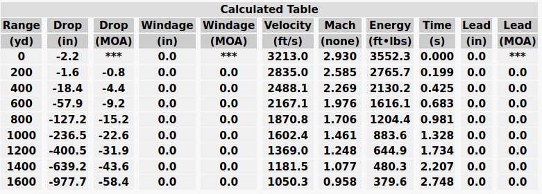From this chart, I can see my predicted drop for a particular range. For hunting purposes, the ballistic chart provides the energy value at particular range, as well as the impact velocity at that range.