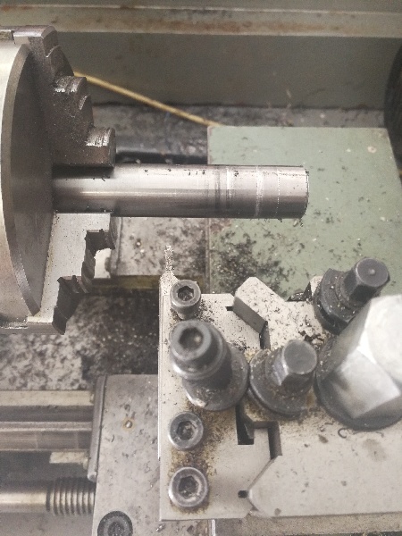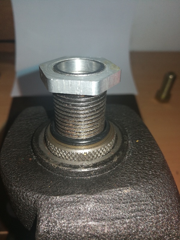 This is just a threaded bar with die body threads, drilled through then lathe turned to accomodate the diameter of the Lyman / RCBS lube sizing dies. It has a step at the top to prevent the die from moving up and out.