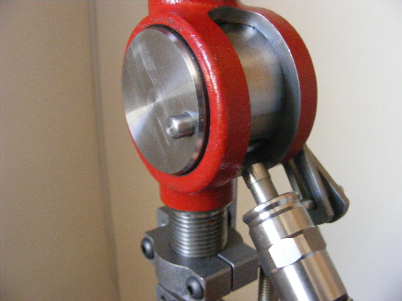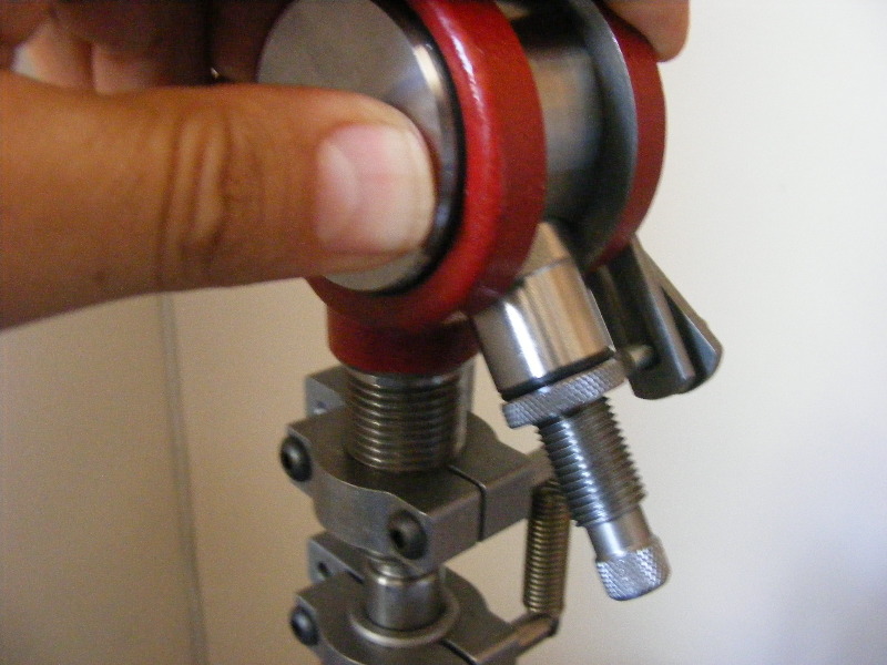 Note that there are two types of powder measure inserts in the box. On the top left, the inserts have a mushroom shaped ends. On the right, dowel shaped. The first type is more suited to large volumes of powder, such as rifle. This insert can dispense in excess of 100 grains of powder.