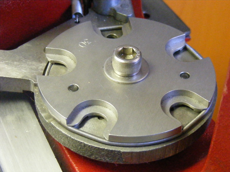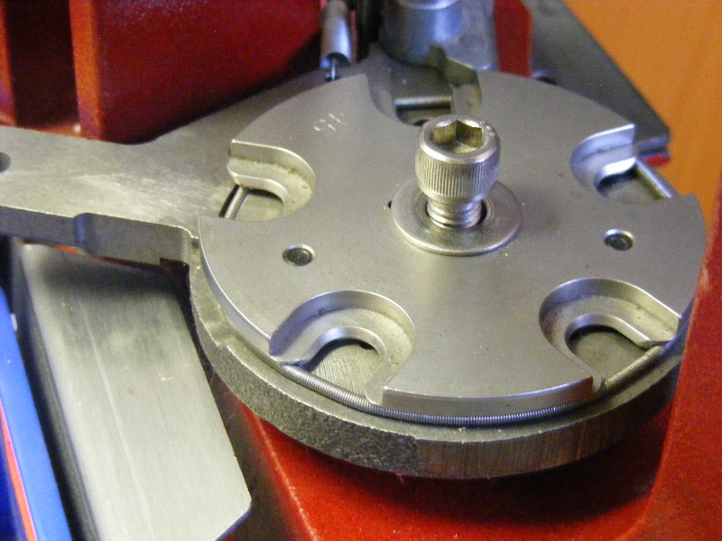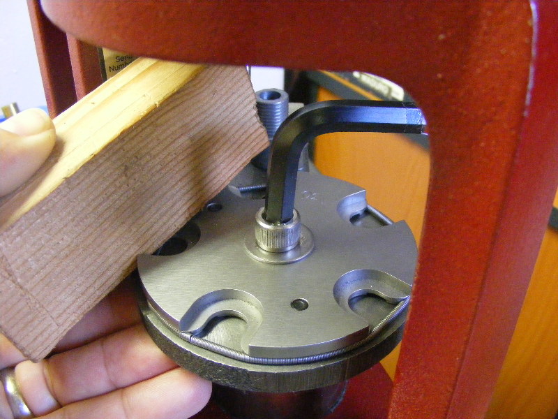 You need to remove the hex-head bolt in the middle of the shellplate. I use a small block of wood to hold the shellplate from rotating while the bolt is undone. Raise the ram a few centimeters while this is being done, to clear the ram off the indexing mechanism.