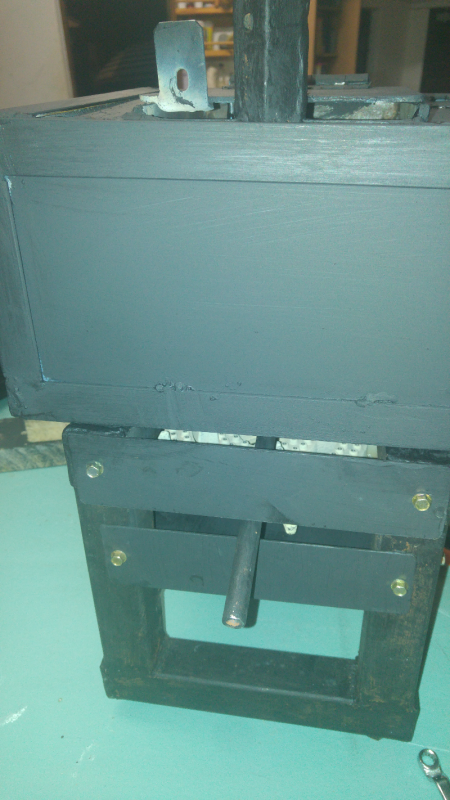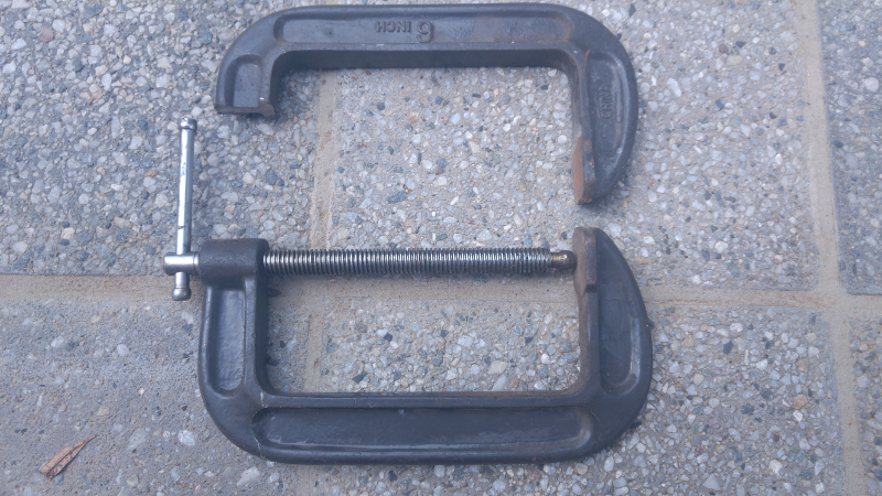 The screw valve here is cut from a C-clamp. I had a 6" C-clamp with no foot on it, and it was easier to cut and weld than machine another taper on the lathe. Using a donor C-clamp is the easiest way to make a bottom pour valve using only a hand drill and some fine sandpaper.