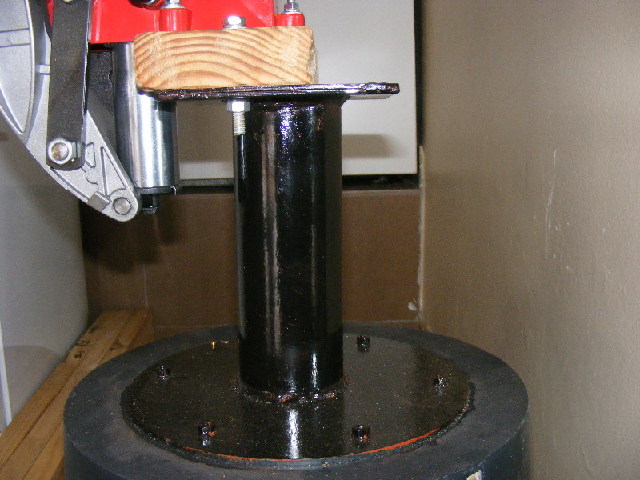Before you weld the square to the end of the tube, make sure the holes for the press mounting bolts are drilled. If a hole is over the mouth of the tube, weld a nut to the underside of the plate for that hole before you weld the square plate to the tube.