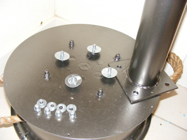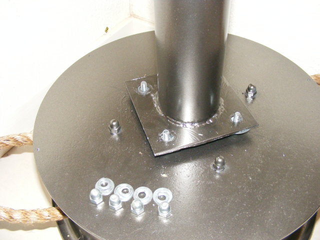 The press stand is bolted to the press base with four nuts. I used dome nuts to protect the threads while transporting and moving around.