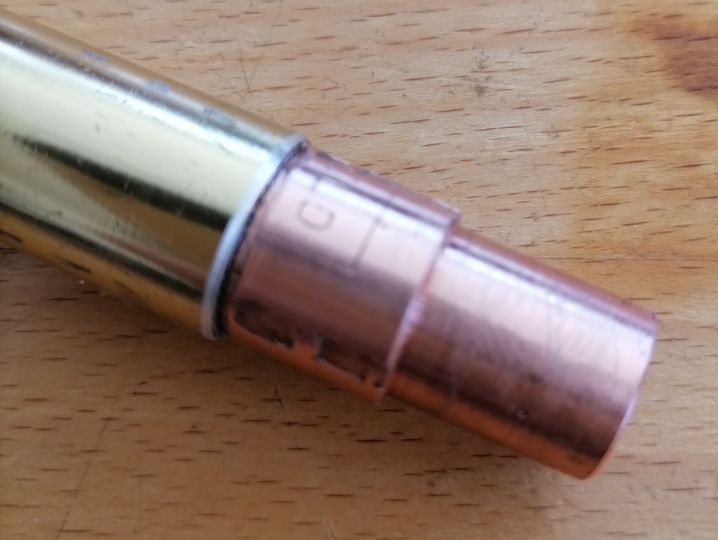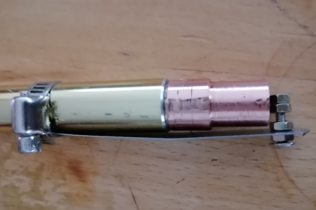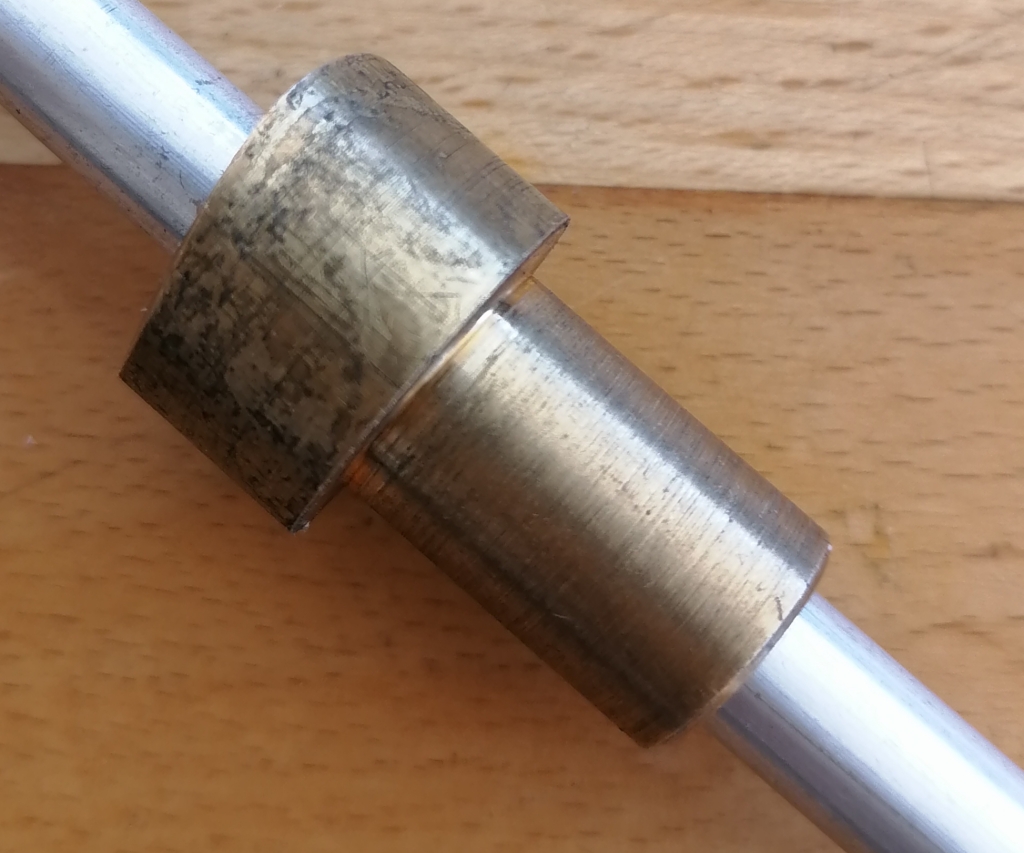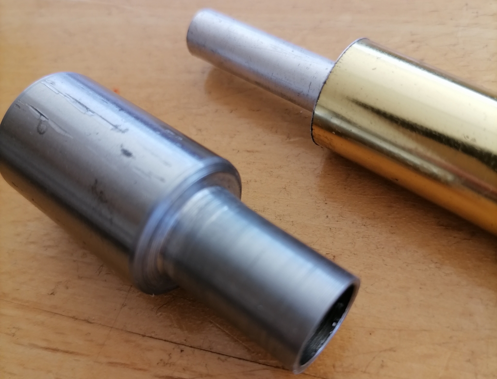My tube housing replacement was an offcut piece of curtain rail. The diameter and thickness of the tube is not critical. The outer tube needs to house an 8mm primer tube. The primer tube will be held centered in the housing by the machined adapters. You'll make the adapters fit whatever tube you have to the priming body and the priming tube. To make the tube primer housing adapter for the primer tube, I used an acetyline torch nozzle, machined to size and drilled through to 8mm . This was machined to press fit into the tube housing.