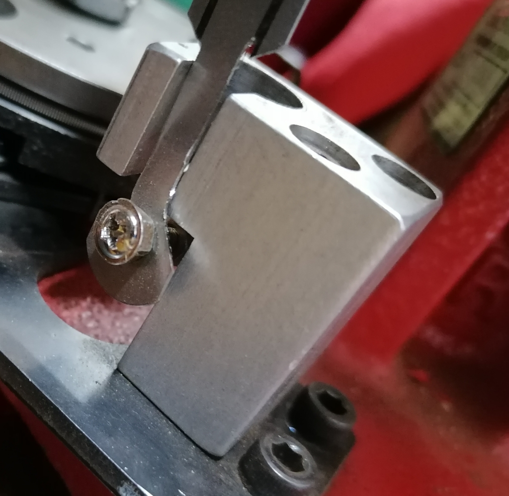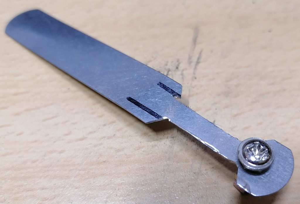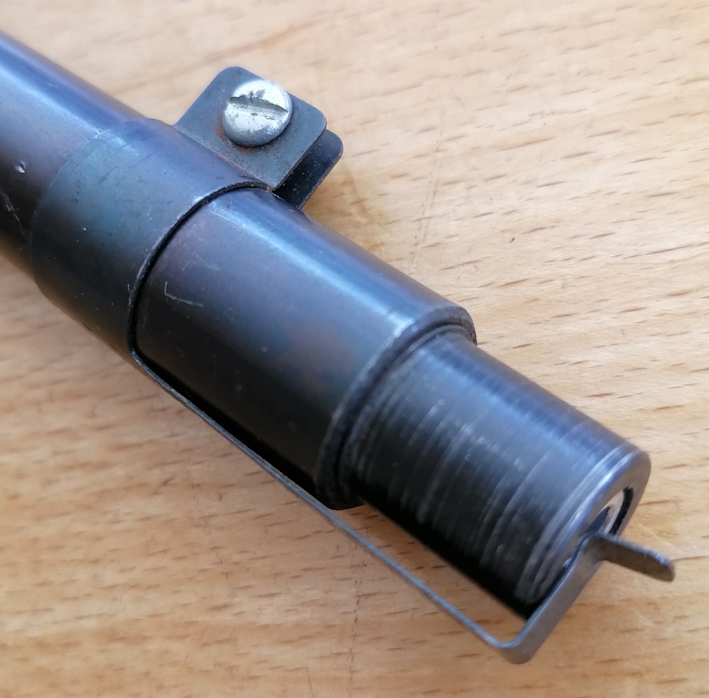 To make a primer spring, a 0.4 mm feeler gauge was used, which is the closest thing on hand to spring steel. A 3mm bolt with a few nuts is fited to the feeler gauge hole, adjusted to keep the stacked primers in place. A hose clamp holds it to the tube housing. The feeler gauge needs to be shaped to fit the primer block.