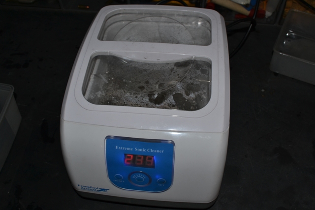 After decapping the brass, it goes into a sonic cleaner for 560 seconds. The mixture I use is made up of 2l hot geyser water (not boiling hot!), ΒΌ teaspoon citric acid, 50ml white vinegar and a good squirt of dishwashing liquid