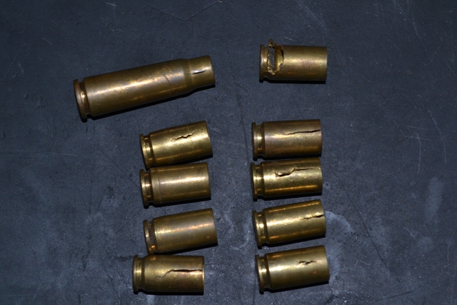 Necked down cases (like rifles and 7.62x25 Tokarev) tends to develop a crack on the case mouth. Included in the picture below is a rifle case (7.62x39) as reference.