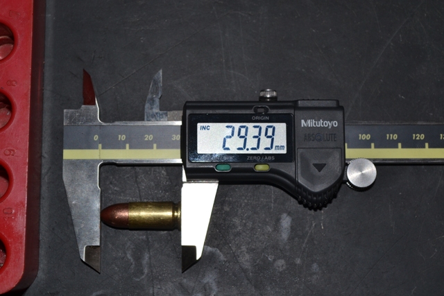 I am using a 147gr CMJ RN (Complete Metal Jacket, Round Nose) bullet from Frontier, as used by most sport shooters out there. Some prefer different weights of bullet, and other like different shapes of bullet. Whichever one you choose, make sure the COL is correct for your handgun. It should be the longest you can make it, but still be able for the round to go fully into battery with your handgun. A bit of experimenting is needed for each type of bullet you want to load. In my example, a COL of 29.4mm is preferred for my combination.