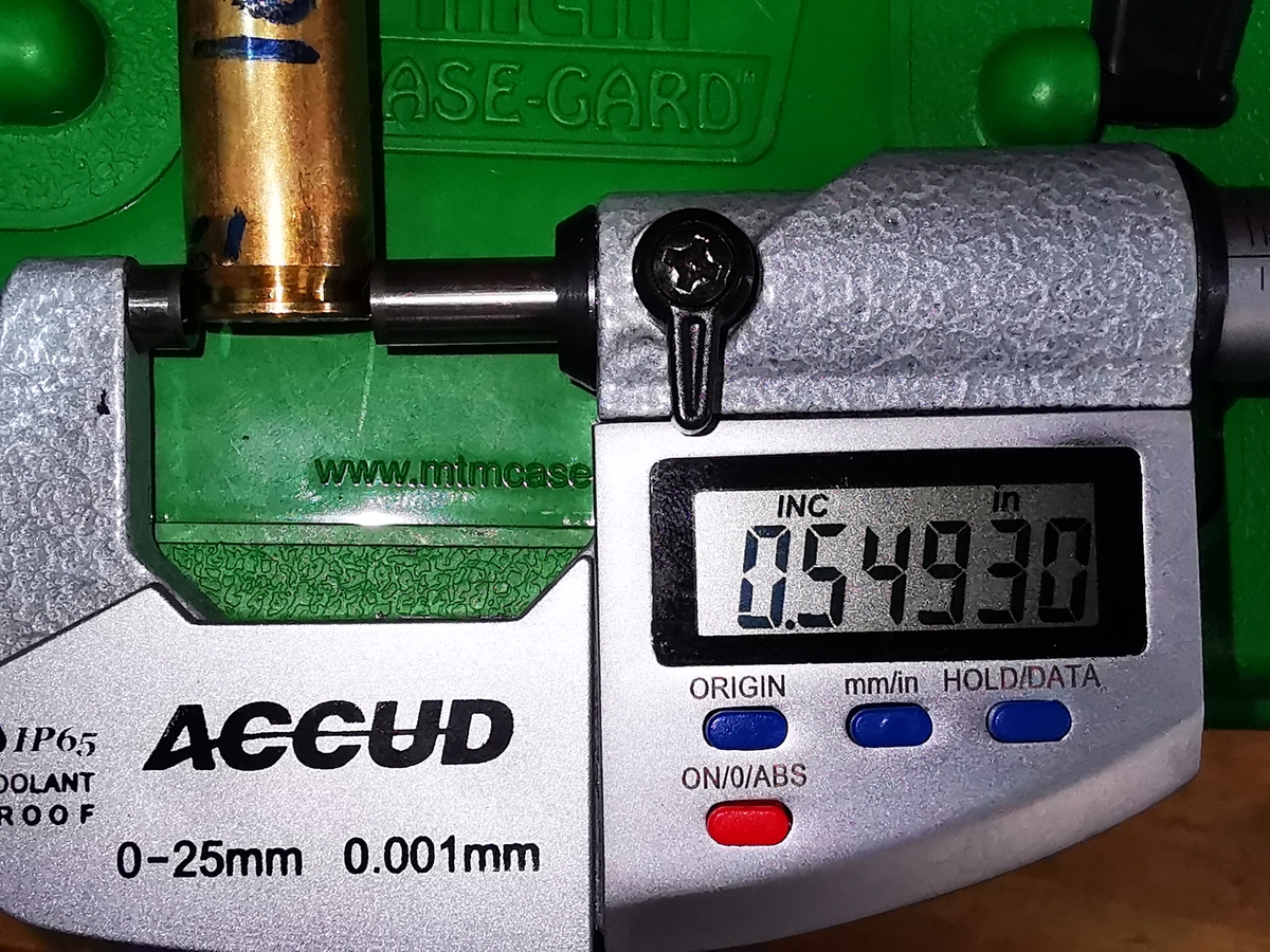 The RUM case has a slightly rebated rim, so a micrometer with a flat anvil works perfectly. Cases without rebated rims are best measured with a point or ball anvil.
