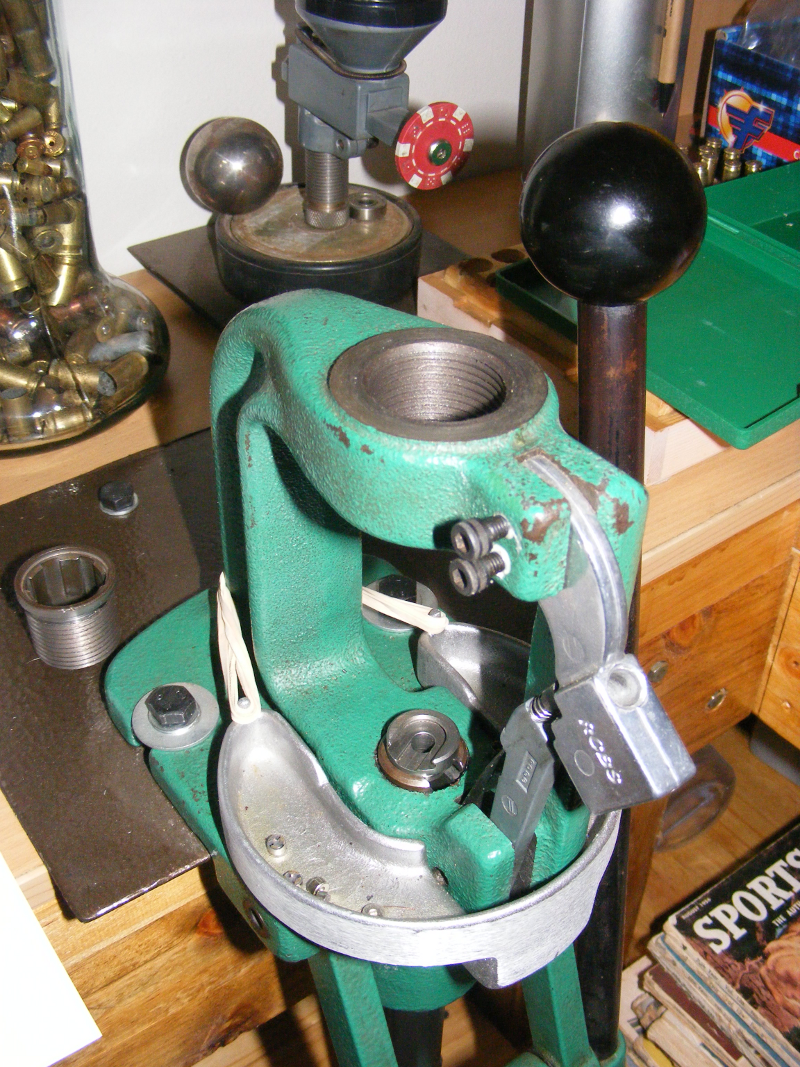 A RCBS Rockchucker is required. The standard die bushing is removed, and replaced with a large body die bushing.