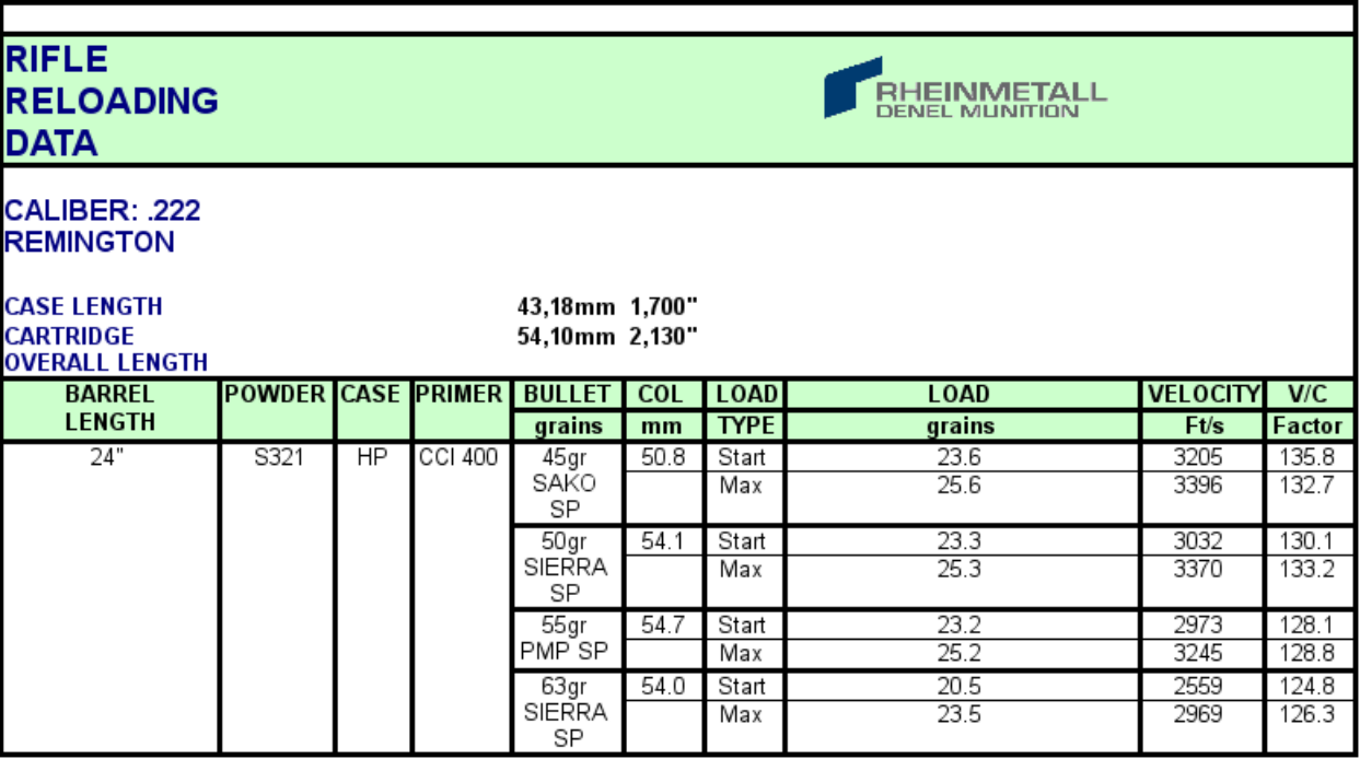 Somchem Rifle Reloading Data   .22 Hornet   .222 Remington   .223 Remington   .22-250-remington   .220 Swift   6mm Musgrave   6.5 x 55mm Swedish Mauser   6.5 x 57mm   .243 Winchester   .25-06 Remington   .264 Winchester   .270 Winchester   .308 Winchester   .30-06 Springfield   .300 H&H Magnum   .300 Winchester Magnum   .303 British   .375 H&H Magnum